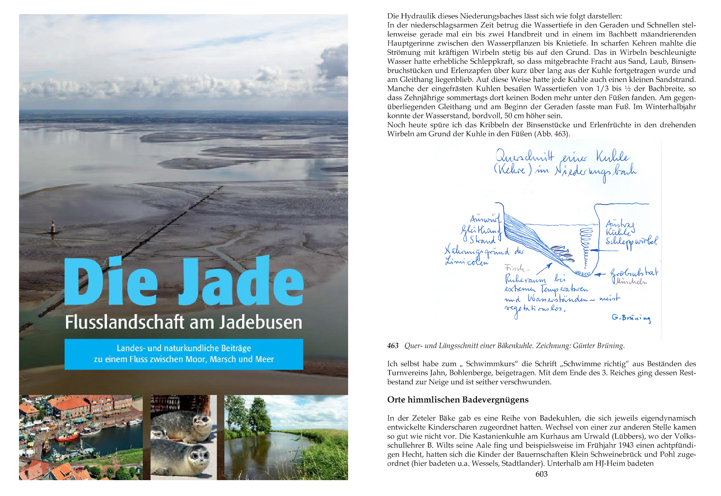 Zeitzeuge Hermann Hinrichs an der Stelle, wo er in der damals dort fließenden Bäke das Schwimmen lernte und Lehrer Dreher Schwimmunterricht für die Kinder der Volksschule Driefel gab (1946). Beispielgebend sprang er im Kopfsprung von der Kante in die Tiefe der Außenkurve (Quer- und Längsschnitt einer Bäkenkuhle).